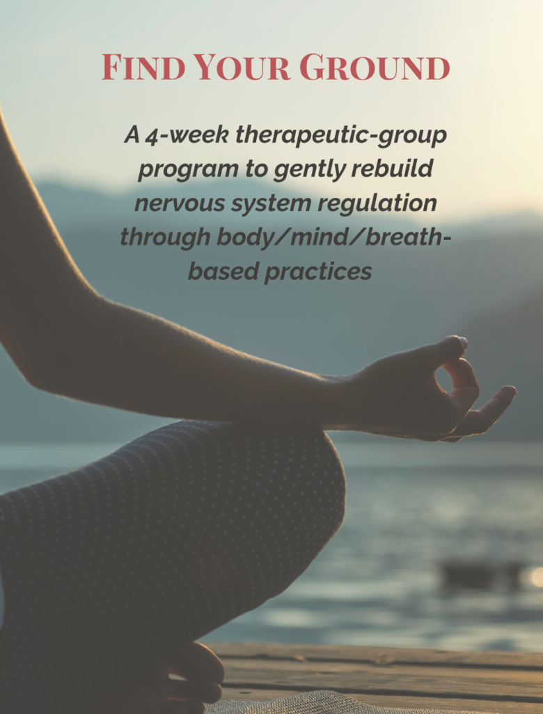 Find Your Ground is a 4-week small-group program designed to gently rebuild nervous system regulation through body/mind/breath-based practices drawn from yoga therapy and contemporary nervous system science.